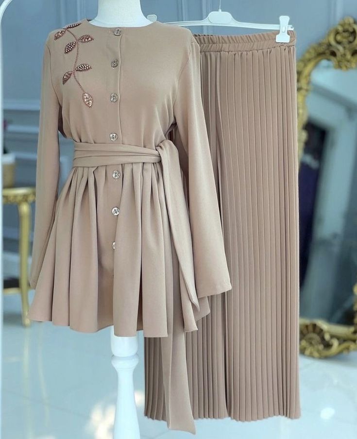 ست دو‌تکه مجلسی زنانه با جاکت دکمه‌دار و دامن پلیسه‌دار