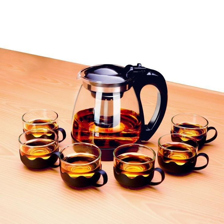 ست قوری چایساز شیشهای با شش فنجان شیشه مقاوم به حرارت با صافی استیل ضدزنگ حدود ۱.۵ لیتر تعداد فنجانها ۶ عدد مناسب برای سرو چای، دمنوش و قهوه