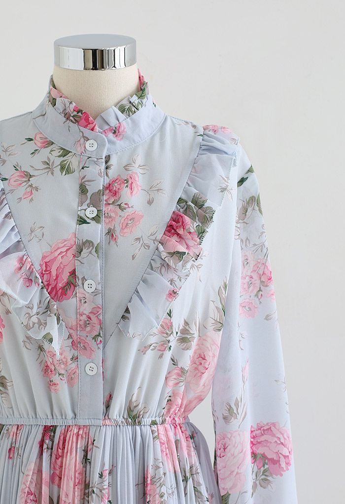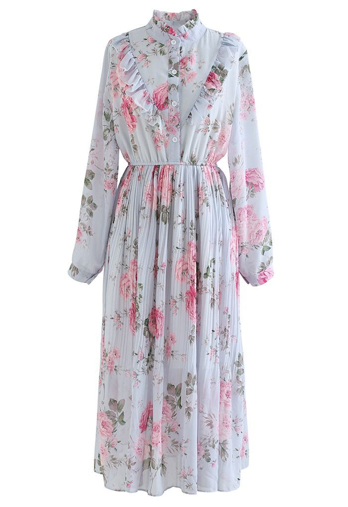 پیراهن گل‌دار بلند زنانه – مدل دکمه‌دار با چین یقه